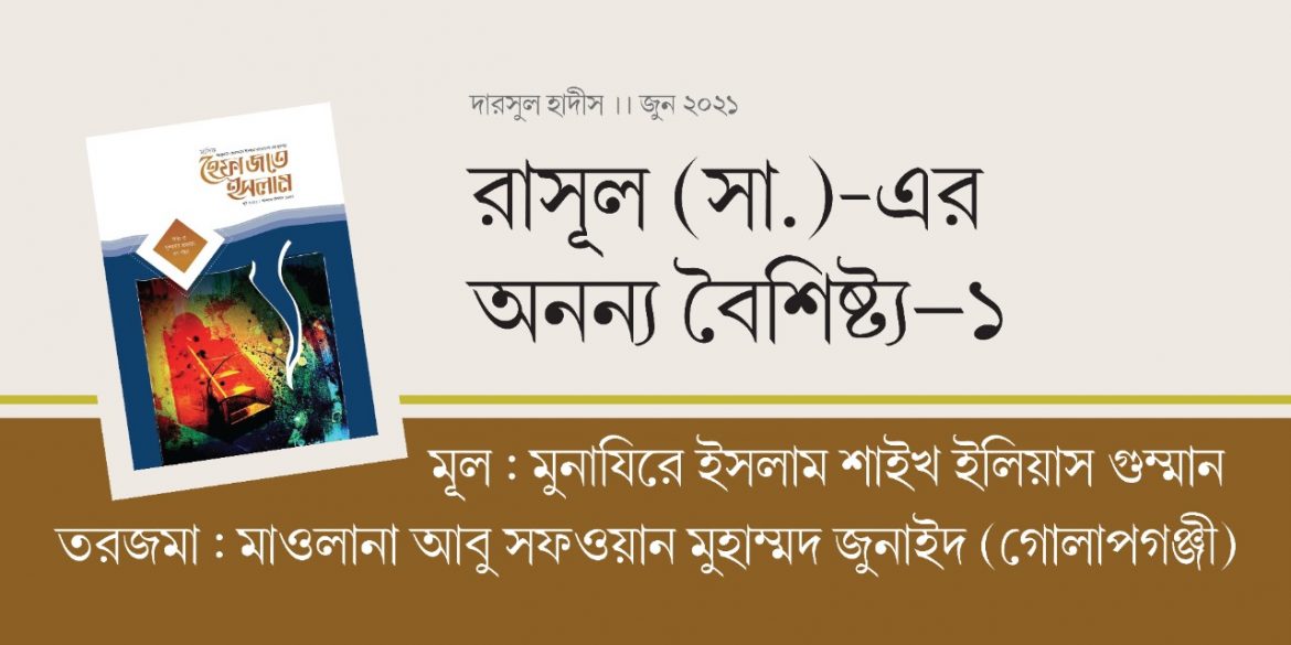 তরজমা : আবু হুরাইরা রাদিয়াল্লাহু আনহু সূ্ত্রে বর্ণিত, রাসূলুল্লাহ সাল্লাল্লাহু আলাইহি ওয়া সাল্লাম বলেছেন, অন্য সব নবীর চাইতে আমাকে ছয়টি বিশেষ মর্যাদা দান করা হয়েছে। আমাকে সংক্ষিপ্ত অথচ ব্যাপক অর্থবোধক কথা বলার ক্ষমতা দেয়া হয়েছে। আমাকে অত্যন্ত প্রভাব দ্বারা সাহায্য করা হয়েছে। আমার জন্য গনীমতের (যুদ্ধলব্ধ) সম্পদ হালাল করা হয়েছে। আমার জন্য গোটা পৃথিবীর ভূমি বা মাটি পবিত্রতা হাসিলকার এবং মসজিদ করা হয়েছে। আমাকে সমগ্র সৃষ্টির জন্য (নবী হিসেবে) পাঠানো হয়েছে। আর আমাকে দিয়ে নবীদের আগমন-ধারা সমাপ্ত করা হয়েছে। [সহীহ মুসলিম, হাদীস-ক্রম : ৫২২]